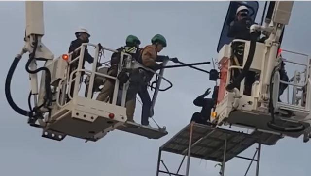 지난달 31일 오전 전남 광양시 포스코 광양제철소 앞에서 고공 농성 중이던 금속노련 간부를 경찰이 진압하고 있다. 한국노총 |