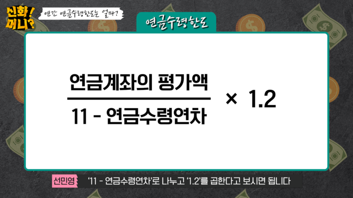 A. 연금 수령 한도는 연금 계좌의 평가액을 11-연금 수령 연차로 나누고 1.2를 곱한다고 보시면 됩니다. 평가액은 매년 달라지기 때문에 연금 수령 한도도 연도별로 달라집니다. 그리고 연금 수령 연차는 일반적으로 1년 차부터 시작하지만, 연금 가입 시점에 따라 6년 차부터 시작하는 경우가 있기 때문에 가입한 금융사에 확인해보시면 좋습니다.