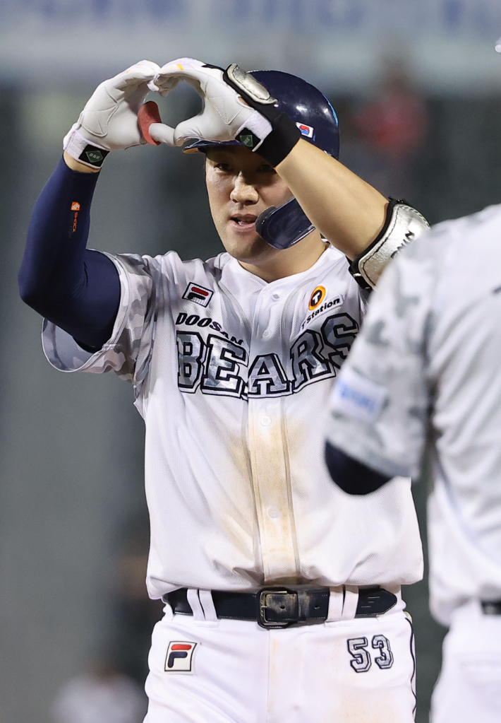 결승타로 팀의 역전승을 이끈 내야수 양석환(32·두산)이 하트 세리머니로 팬들에게 고마움을 전했다.