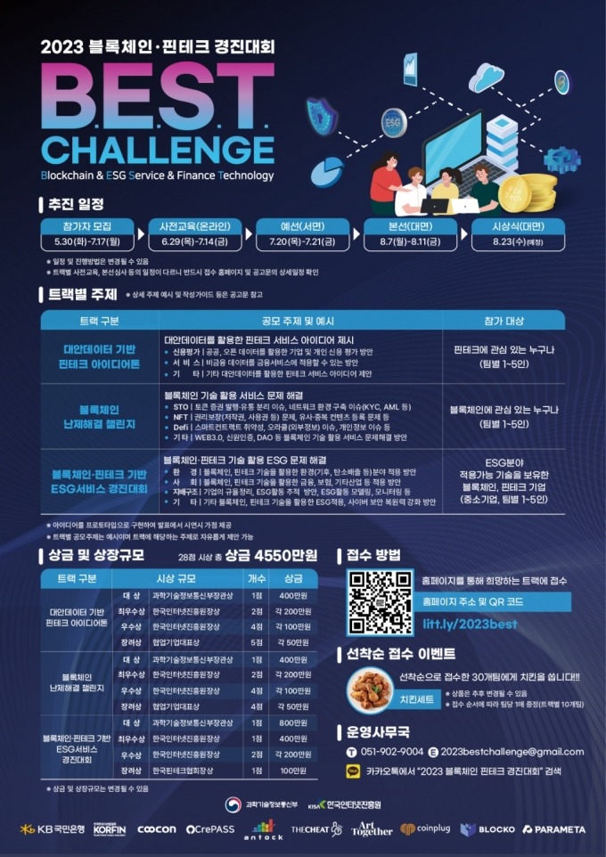 이번 대회는 블록체인·핀테크 분야에 관심있는 개인 또는 중소기업(5명 이내 팀 구성) 누구나 참여 가능하다. 오는 7월17일까지 온라인으로 접수 받는다. 접수 및 대회 기간에는 참가자 대상 협업기업 전문가들의 사전교육, 멘토링 등이 진행될 예정이다.