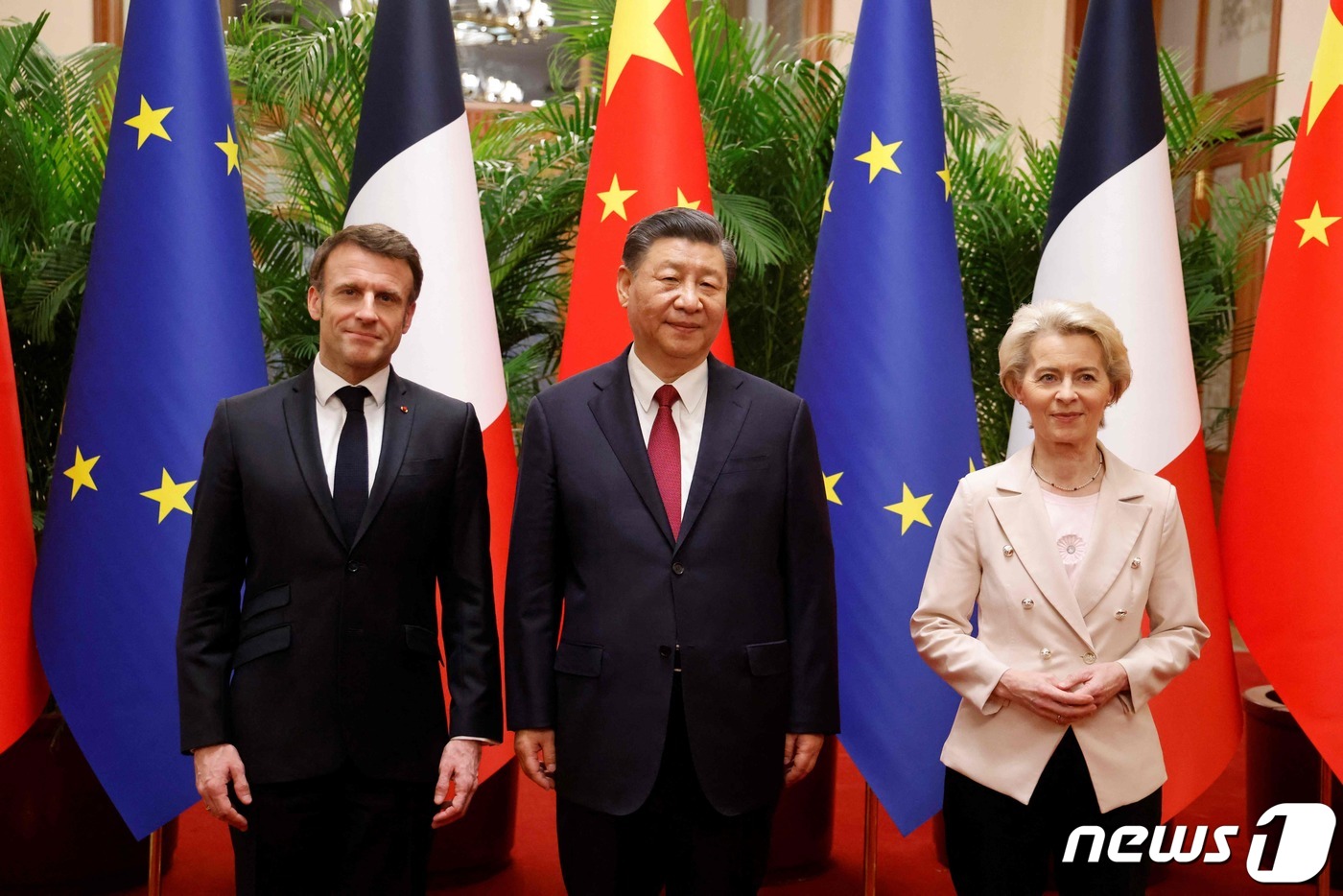 에마뉘엘 마크롱 프랑스 대통령과 시진핑 중국 국가주석, 우르줄라 폰데어라이엔 EU 집행위원장이 지난 4월 베이징에서 실무 회담에 앞서 포즈를 취한 모습이다. 2023.4.6/ⓒ AFP=뉴스1 ⓒ News1 우동명 기자 |