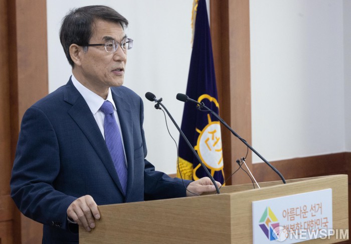 [과천=뉴스핌] 윤창빈 기자 = 노태악 중앙선거관리위원회 위원장이 지난달 31일 오후 경기 과천시 중앙선거관리위원회에서 고위직 간부들의 자녀 특혜 채용 의혹 관련 대응 방안 등을 논의하기 위해 열린 긴급회의를 마치고 입장문을 발표하고 있다. 2023.05.31 pangbin@newspim.com |
