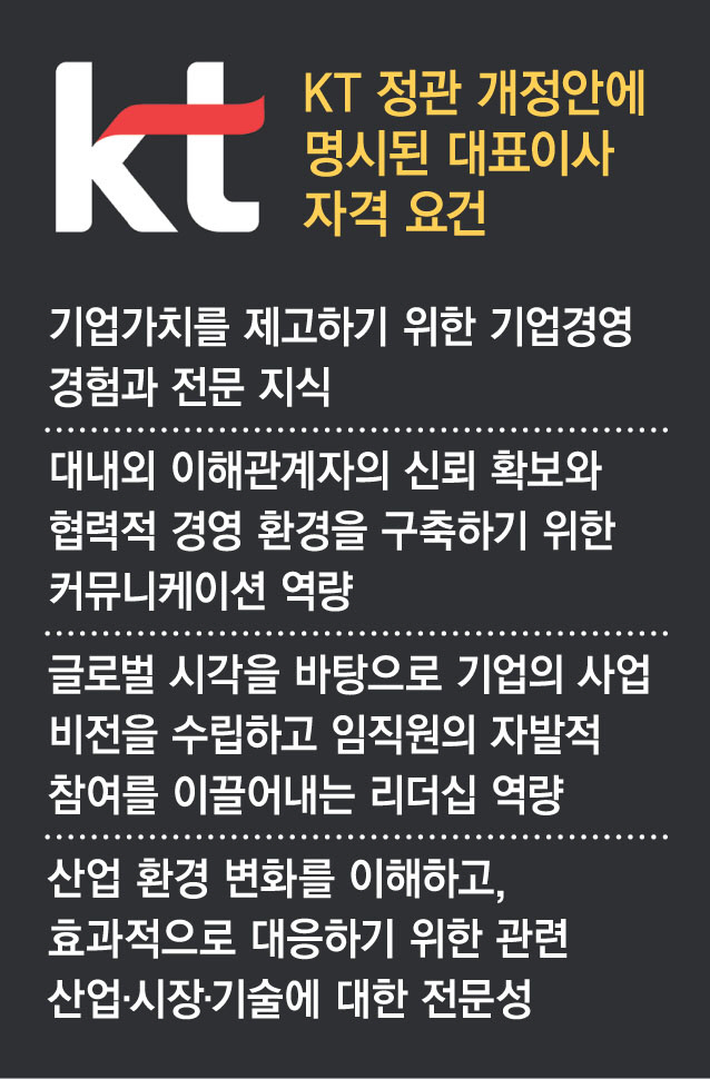 KT가 법인의 근본 규칙인 정관에 명시된 대표이사 자격 요건에서 ‘정보통신 전문성’ 항목을 뺐다. 표면적으로는 본업인 정보통신을 넘어 다양한 산업과의 이종교배가 필요하다는 논리지만 여권이 추천하는 ‘낙하산 인사’를 대표로 임명하기 위한 수순 아니냐는 해석이 나온다.