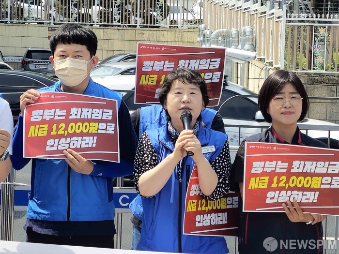 [서울=뉴스핌] 대한민국공무원노동조합총연맹(공노총)이 19일 오전 용산 대통령실 앞에서 개최한 2024년 최저임금 인상 촉구 기자회견에서 석현정 위원장이 발언을 하고 있다.[사진=공노총] 2023.06.19 photo@newspim.com