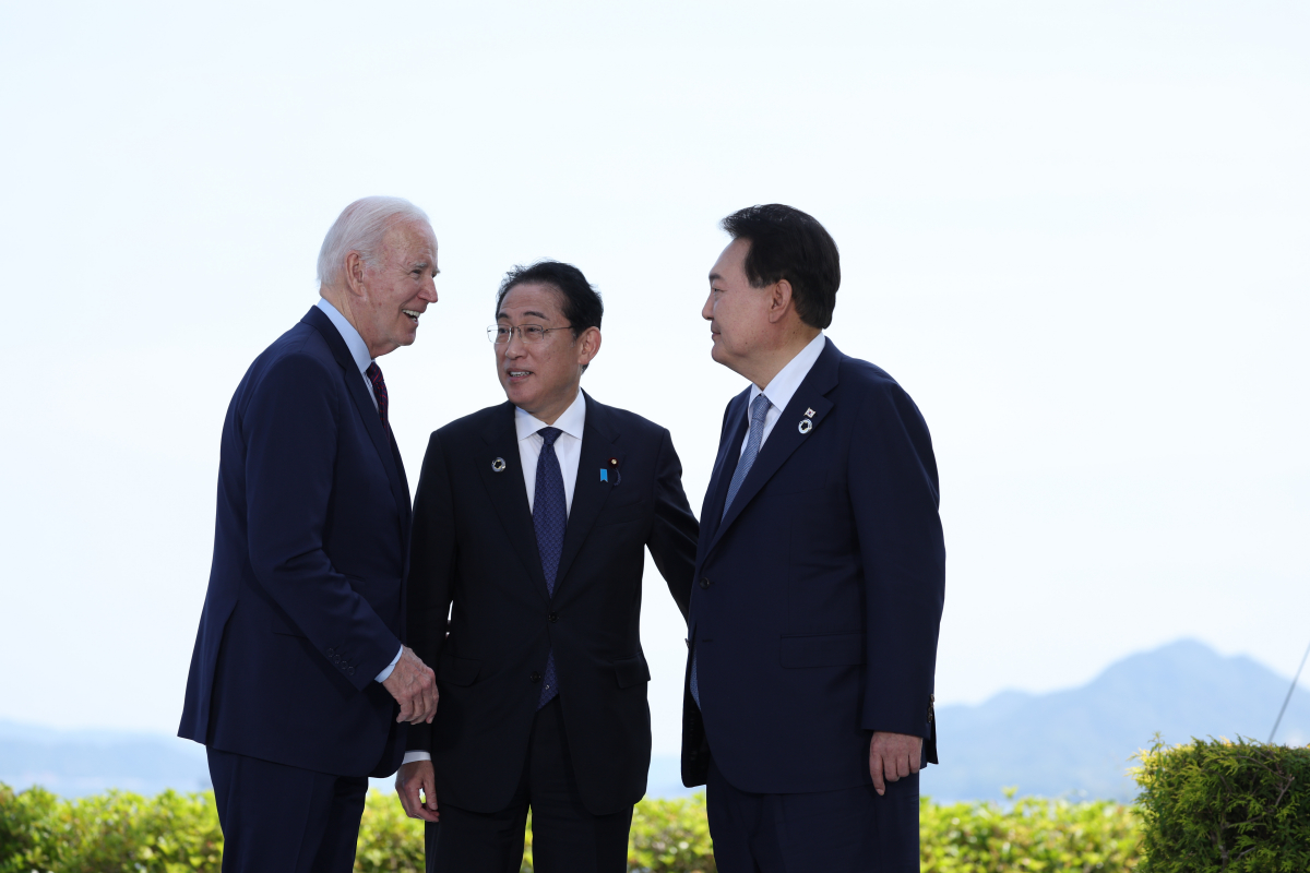 윤석열 대통령이 21일히로시마 G7 정상회의장인 그랜드프린스호텔에서 조 바이든 미국 대통령, 기시다 후미오 일본 총리와 인사하고 있다. |