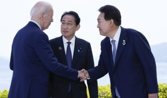 지난달 열린 G7 정상회의에서 조 바이든 미국 대통령(왼쪽부터), 기시다 후미오 일본총리, 윤석열 대통령이 대화를 나누고 있다. [연합] |
