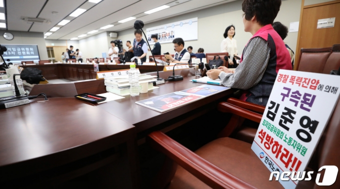 8일 오후 세종시 정부세종청사 최저임금위원회 회의실에서 열린 제3차 전원회의에 참석하지 못한 한국노총 소속 김준영 노동자위원의 빈 자리에 석방 촉구 손팻말이 놓여 있다. /사진=뉴스1 |
