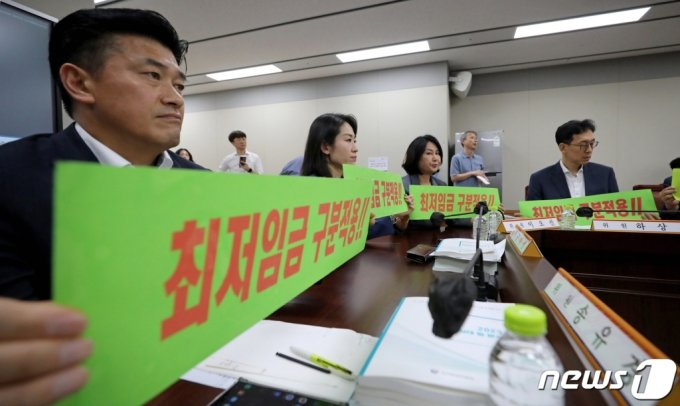 22일 정부세종청사에서 열린 최저임금위원회 제7차 전원회의에서 사용자위원들이 최저임금 구분적용 손피켓을 들고 있다./사진=뉴스1. |