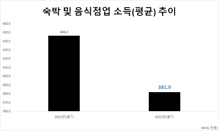 25일 마이크로데이터통합서비스(MDIS)에서 숙박 및 음식점업 가구주 평균을 추출한 결과에 따르면 올해 1분기 소득은 381만9000원에 불과했다. 지난해 1분기 446만4000원에서 큰 폭으로 소득이 감소했다.
