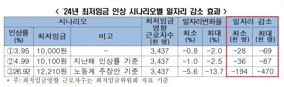 보고서는 노동계 요구대로 최저임금을 1만2210원(26.9%)으로 인상하면 일자리 감소폭은 최소 19만4000개에서 최대 47만개로 추정했다.