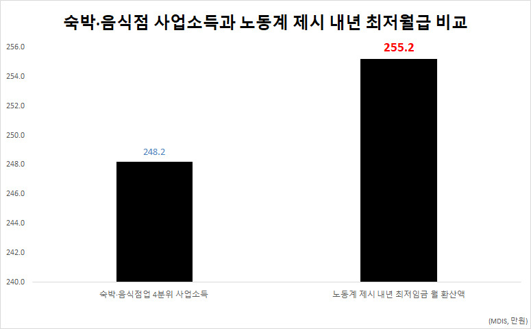 이는 가구주 전체 소득을 따진 결과다. 근로자외 가구 숙박 및 음식점업 종사자 4분위의 사업소득은 248만2000원이다. 5분위도 269만4000원에 불과해 최저임금 근로자 월급과 별반 차이가 없다. 음식·숙박업에서 사업소득으로 상위 50% 안에 들어야 최저임금자와 비슷한 수준을 벌 수 있는 것이다.