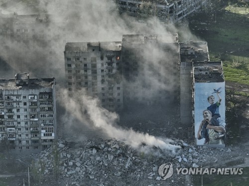우크라 바흐무트의 파괴된 건물서 피어오르는 연기 |