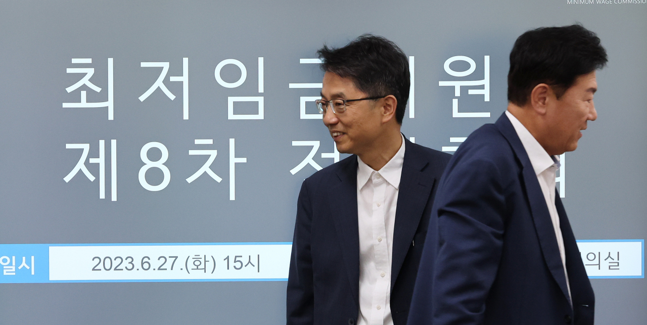 박준식 최저임금위원회 위원장이 27일 오후 세종시 정부세종청사 최저임금위원회 회의실에서 열린 제8차 전원회의에 입장하고 있다. 오른쪽은 사용자위원인 류기정 한국경영자총협회 전무. [연합] |