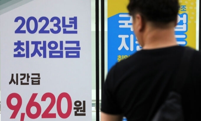 서울의 한 고용복지플러스센터에 2023년 시간당 최저임금 현수막이 게시되어 있다. 뉴시스 |