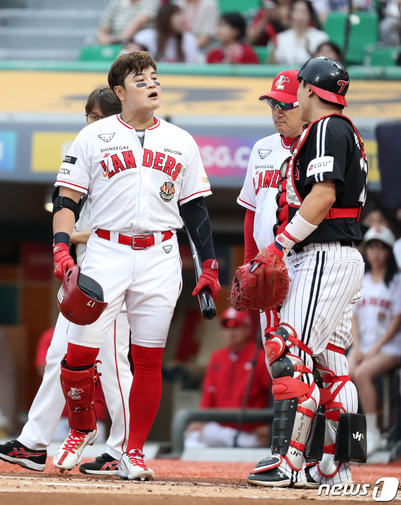 28일 인천 SSG랜더스필드에서 열린 '2023 신한은행 SOL KBO리그' LG 트윈스와 SSG 랜더스의 경기, SSG 추신수가 1회말 무사 선두타자로 나서 LG 선발 이지강의 투구에 맞은 후 포수 박동원과 신경전을 벌이고 있다. 2023.6.28/뉴스1 ⓒ News1 김성진 기자 |