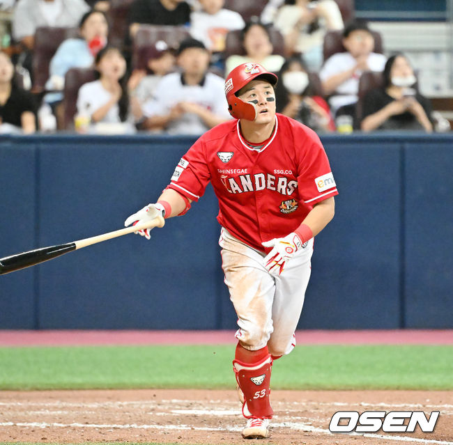 [OSEN=고척, 민경훈 기자]9회초 1사 주자 3루 SSG 이재원이 우익수 뒤 1타점 적시 2루타를 날리고 있다. 2023.06.30 /rumi@osen.co.kr |