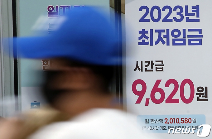 지난달 30일 오전 한 시민이 올해 최저임금 9,620원을 알리는 입간판 앞을 지나고 있다./사진=뉴스1. |