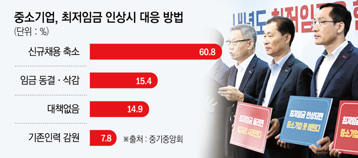 중기중앙회가 중소기업 618개를 대상으로 조사한 결과에 따르면 최저임금 인상 시 신규채용을 축소하겠다는 답변은 60.8%, 기존인력을 감원하겠다는 기업은 7.8% 등으로 집계돼 총 68.6%가 고용을 축소하겠다는 의사를 밝혔다. 임금을 동결하거나 삭감하겠다는 기업도 15.4%를 차지했다.