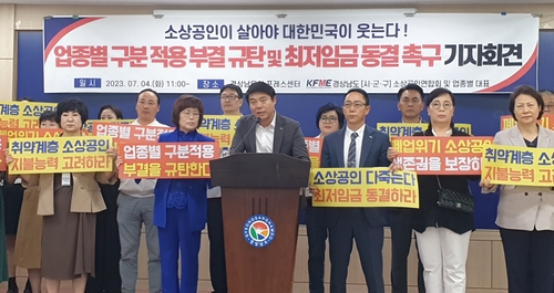경상남도소상공인연합회는 4일 오전 경남도청 프레스센터에서 기자회견을 열고 "최저임금 업종별 구분 적용 부결은 근로자 생계비와 노동 강도 및 생산성 차이를 고려하지 않은 결과"라고 주장했다.