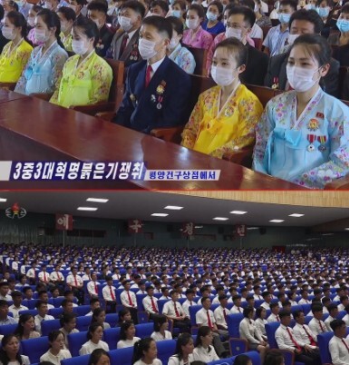 북한 당국이 7월부터 주민들의 마스크 착용 의무를 해제한 것으로 전해졌다. 조선중앙TV를 보면 지난 3일에는 함경북도 청년 수백여 명이 '노마스크' 상태로 극장에 빼곡히 앉아있는 모습(아래 사진)이 방송됐다. 조선중앙TV 방송화면 |