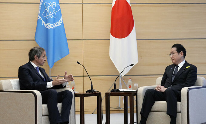 라파엘 그로시(왼쪽) 국제원자력기구(IAEA) 사무총장이 지난 4일 일본 도쿄의 총리 관저에서 기시다 후미오 일본 총리에게 IAEA의 후쿠시마 오염수 방류 종합보고서를 전달하기 전 기시다 총리와 대화하고 있다. AP뉴시스 |