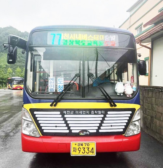 군은 950여만원의 예산을 들여 호명면 신도시와 예천읍 원도심을 운영하는 77번, 88번 버스 총 7대에 미세먼지 흡착 필터를 부착했다.