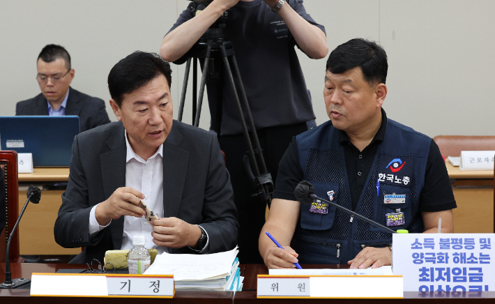 6일 오후 세종시 정부세종청사 최저임금위원회 회의실에서 열린 제11차 전원회의에서 사용자위원인 류기정 한국경영자총협회 전무(왼쪽)와 근로자위원인 류기섭 한국노총 사무총장이 대화하고 있다. 연합뉴스 |