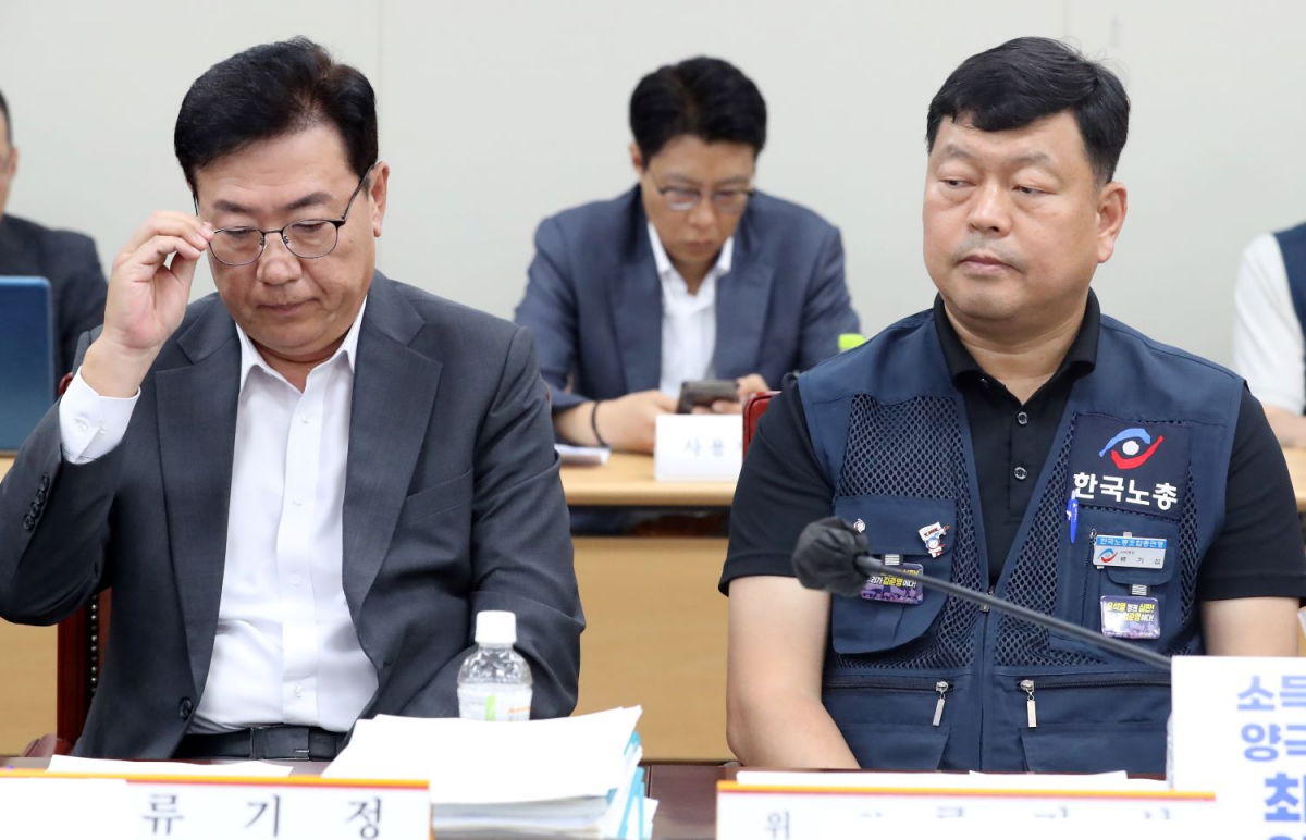 6일 세종시 정부세종청사에서 열린 최저임금위원회 11차 전원회의에서 류기정 사용자 위원이 안경을 고쳐쓰고 있다. 오른쪽은 류기섭 근로자 위원. |