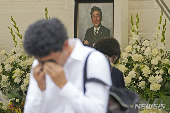 [도쿄=AP/뉴시스] 한 남성이 8일 일본 수도 도쿄 미나토구에 자리한 조죠지 사찰에서 열린 아베 신조 전 일본 총리 1주기 법요에 참석해 흐느끼고 있다. 지난해 7월8일 아베 전 총리는 나라현 나라시에서 참의원 선거 지원 연설 도중 총격을 받아 숨졌다. 2023.07.08. |