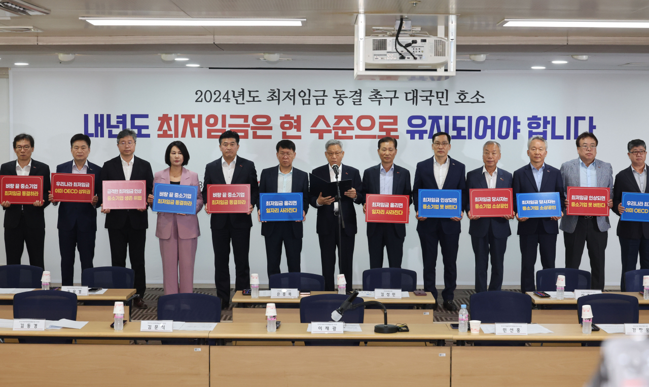 수출 중소기업 최고경영자(CEO)와 임원의 75%는 내년도 최저임금이 동결 또는 인하돼야 한다고 생각하는 것으로 나타났다. 3일 서울 여의도 중소기업중앙회에서 열린 2024년 최저임금 합리적 결정 촉구를 위한 중소기업계 입장발표 기자회견 모습 [연합] |