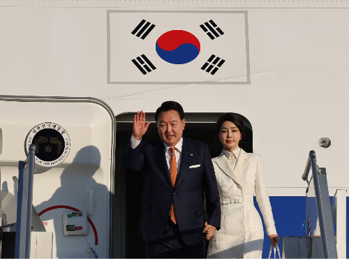 윤석열 대통령과 김건희 여사가 10일 오후(현지시간) 리투아니아 빌뉴스 국제공항에 도착, 전용기인 공군 1호기에서 내리며 영접객을 향해 손을 들어 인사하고 있다. 연합뉴스 |