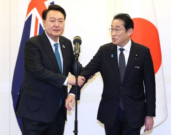 북대서양조약기구(NATO·나토) 정상회의에 참석한 윤석열 대통령이 12일(현지시간) 빌뉴스 한 호텔에서 가진 한국·일본·호주·뉴질랜드 4개국(AP4) 정상회담에서 기사다 후미오 일본 총리와 발언 순서를 양보하고 있다. [이미지출처=연합뉴스] |