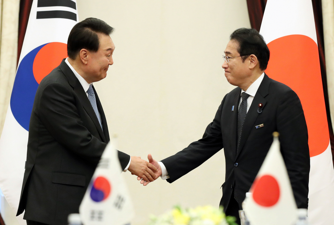 북대서양조약기구(NATO·나토) 정상회의 참석차 리투아니아를 방문 중인 윤석열 대통령이 12일 빌뉴스 한 호텔에서 열린 한일 정상회담에서 기시다 후미오 일본 총리와 악수하고 있다. [연합] |