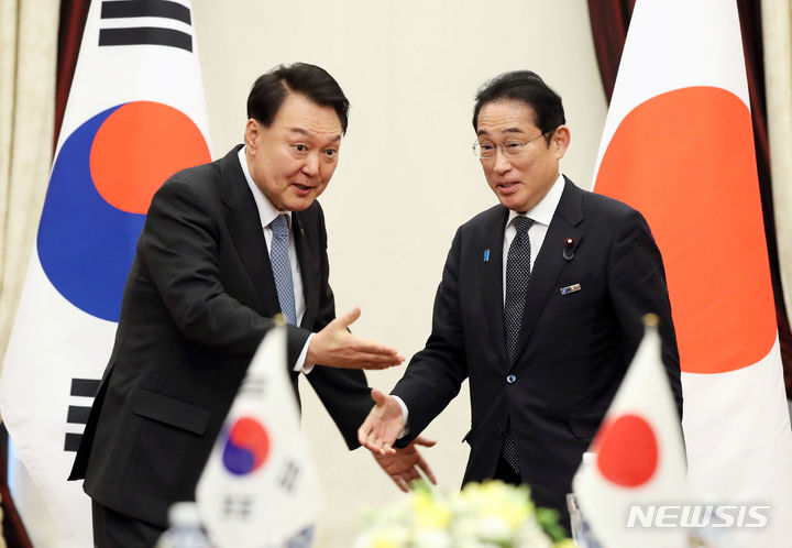 윤 대통령은 이날 리투아니아 빌뉴스에서 기시다 총리와 나토(NATO 북대서양조약기구)정상회의 계기의 한일 정상회담을 가졌다. 양 정상간 만남은 윤 대통령 취임후 이번이 여섯번째다.