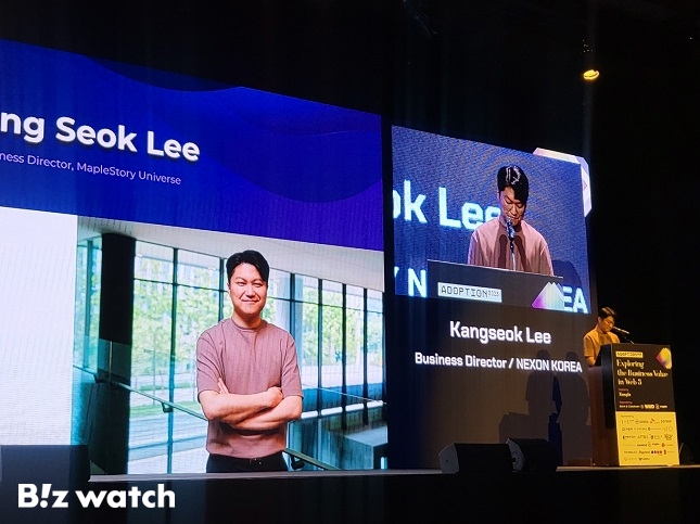 이강석 넥슨 사업실장은 12일 서울 신라호텔에서 열린 '어돕션 2023'에서 '넥슨이 왜 블록체인 기술을 택했는가?'라는 주제로 발표했다. /사진=비즈워치 |
