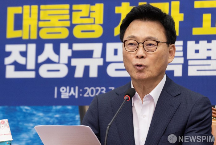[서울=뉴스핌] 윤창빈 기자 = 박광온 더불어민주당 원내대표가 13일 오후 서울 여의도 국회에서 열린 대통령 처가 고속도로게이트 진상규명 특별위원회 발족식에서 모두발언을 하고 있다. 2023.07.13 pangbin@newspim.com