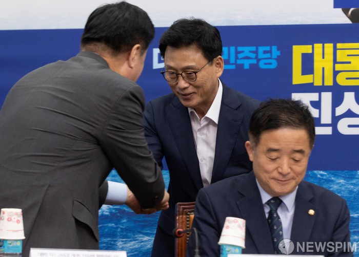 [서울=뉴스핌] 윤창빈 기자 = 박광온 더불어민주당 원내대표가 13일 오후 서울 여의도 국회에서 열린 대통령 처가 고속도로게이트 진상규명 특별위원회 발족식에 참석하며 의원들과 인사를 나누고 있다. 2023.07.13 pangbin@newspim.com