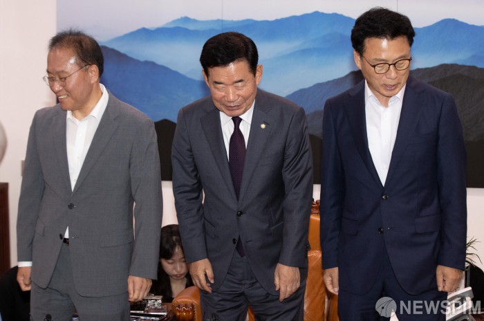 [서울=뉴스핌] 윤창빈 기자 = 윤재옥 국민의힘 원내대표(왼쪽부터), 김진표 국회의장, 박광온 더불어민주당 원내대표가 13일 오후 서울 여의도 국회에서 국회의장 주재로 열린 양당 원내대표 회동에서 기념촬영을 하고 있다. 2023.07.13 pangbin@newspim.com