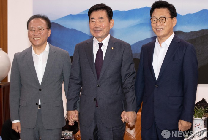 [서울=뉴스핌] 윤창빈 기자 = 윤재옥 국민의힘 원내대표(왼쪽부터), 김진표 국회의장, 박광온 더불어민주당 원내대표가 13일 오후 서울 여의도 국회에서 국회의장 주재로 열린 양당 원내대표 회동에서 기념촬영을 하고 있다. 2023.07.13 pangbin@newspim.com
