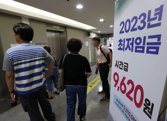내년도 최저임금 수준 결정을 앞두고 있는 13일 오후 서울 마포구 서부고용복지플러스센터에 2023년도 최저임금인 9620원을 알리는 안내문이 놓여 있다. [이미지출처=연합뉴스] |