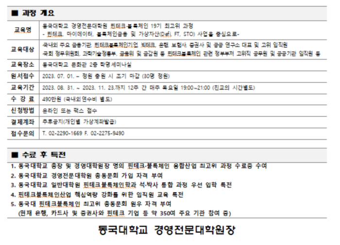 아울러 명예원우 및 강사로 참여하는 금융위원회와 금융감독원, 언론 매체, 핀테크 연구기관 등 스마트 금융분야 정부 및 공공기관과의 교류를 통해 정부와 공공정책 기조 및 동향도 파악할 수 있다. 과정 수료자는 국내 최초로 동국대학교 대학원에 개설되는 핀테크블록체인 석박사 통합과정 입학 특전이 주어진다.