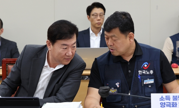 내년도 최저임금 결정이 임박한 가운데 18일 정부세종청사 최저임금위원회 회의실에서 열린 제14차 전원회의에서 사용자위원인 류기정(사진 왼쪽) 한국경영자총협회 전무와 근로자위원인 류기섭 한국노총 사무총장이 대화하고 있다. 연합뉴스 |
