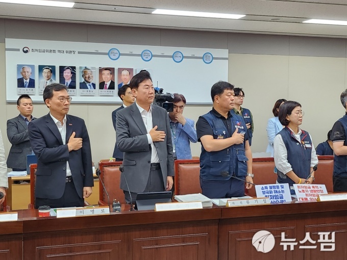 [세종=뉴스핌] 정성훈 기자 = 18일 정부세종청사 최저임금위원회 대회의실에서 열린 '제14차 전원회의'에서 노사 대표들이 국민의례를 하고 있다. 2023.07.18 jsh@newspim.com 2023.07.18 jsh@newspim.com |