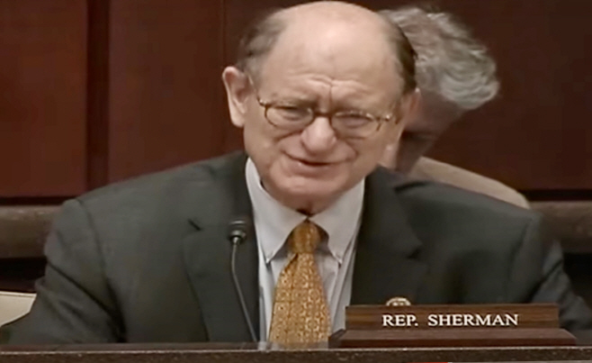 브래드 셔먼 미국 민주당 하원의원이 18일(현지시간) 워싱턴 D.C. 연방의회의사당에서 진행된 하원 외교위원회 인도·태평양소위원회 청문회에서 대니얼 크리튼브링크 국무부 동아시아·태평양 담당 차관보에게 질의를 하고 있다./인·태소위 동영상 캡처 |