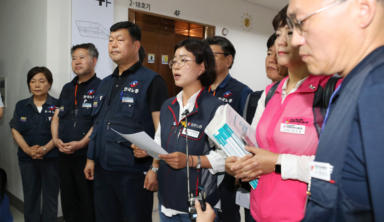 19일 최저임금위 근로자위원들은 2024년도 최저임금 수준 표결 이후 정부세종청사 고용노동부 기자실 앞에서 브리핑을 열고 이번 최저임금위 논의 과정에 대해 강하게 비판했다.