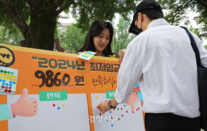2024년 최저임금이 9860원으로 정해진 19일 서울 종로구 마로니에 공원에서 알바촛불행동이 실시한 최저임금 스티커 설문에 한 시민이 불만족에 스티커를 붙이고 있다. 한수빈 기자 |