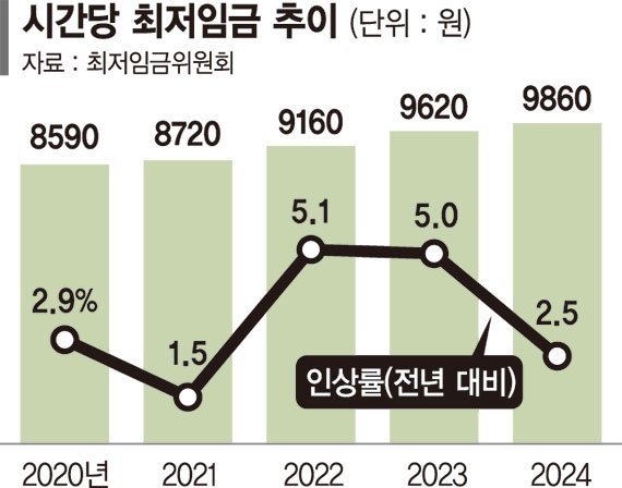 내년도 최저임금은 올해 최저임금 9620원보다 240원(2.5%) 오른다. 월 환산액(월 노동시간 209시간 기준)은 206만740원이다. 올해 인상률은 코로나19 시기인 2021년(1.5%) 이후 역대 두 번째로 낮다.