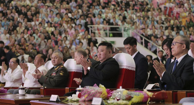 김 위원장은 27일 0시 평양 류경정주영체육관에서 열린 기념공연을 중국, 러시아 대표단과 함께 관람했다고 북한 관영매체인 조선중앙통신이 보도했다. 통신은 김 위원장 왼쪽에 중국 전국인민대표대회 상무위원회 리훙중(李鴻忠) 부위원장(국회 부의장 격), 오른쪽에 러시아의 세르게이 쇼이구 국방장관이 앉아 공연을 관람하는 사진을 공개했다. 전날 방북한 리 부위원장은 시 주석의 특별 대표(특사) 자격으로 왔다.