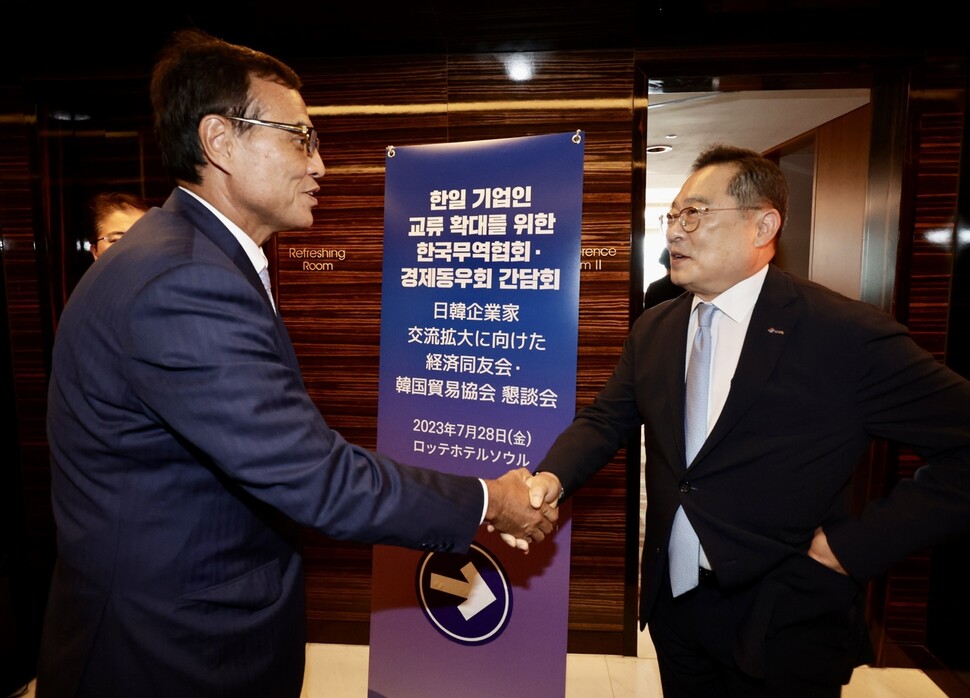지난 28일 서울 중구 롯데호텔에서 열린 ‘일본 경제동우회 대표단 간담회’에서 구자열(오른쪽) 한국무역협회 회장과 일본 경제동우회 대표 간사를 맡은 니이나미 다케시 산토리 홀딩스 회장이 악수하고 있다. 이날 간담회에는 신동빈 롯데그룹 회장, 조현준 효성그룹 회장 등 국내 기업 대표와 다마츠카 겐이치 일본 롯데홀딩스 대표, 다나카 요시카즈 경제동우회 오픈이노베이션위원장 등 일본 경제인 11명이 참석했다. 1946년 설립된 비영리 사단법인인 일본 경제동우회는 일본경제단체연합회, 일본상공회의소와 함께 일본의 3대 경제단체로 일본 주요 기업인 1500여 명이 회원으로 가입해 있다.
