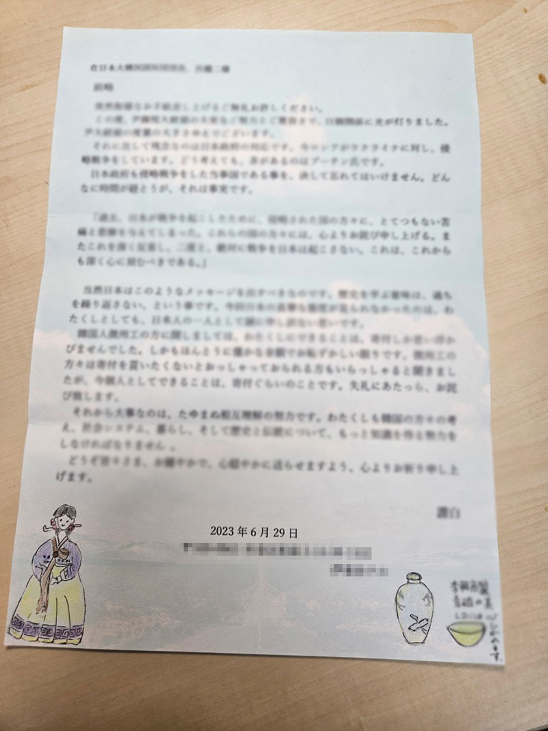 강제징용 피해자들 중 일부가 ‘제3자 변제’를 거부하는 상황과 관련해선 A 씨는 “지금 개인으로서 할 수 있는 일은 기부 정도인데 (피해자들에게) 실례라면 사과드린다”고 적었다. 이어 “중요한 건 상호 이해를 위한 끊임 없는 노력”이라며 “저도 한국분들의 생각과 사회구조, 생활, 역사와 전통에 대해 지식을 얻을 수 있도록 노력하겠다”고 했다. 이런 마음을 표현하듯 A 씨는 편지지 아래쪽엔 한복을 입은 여성과 이조 백자 그림을 직접 그려넣었다.